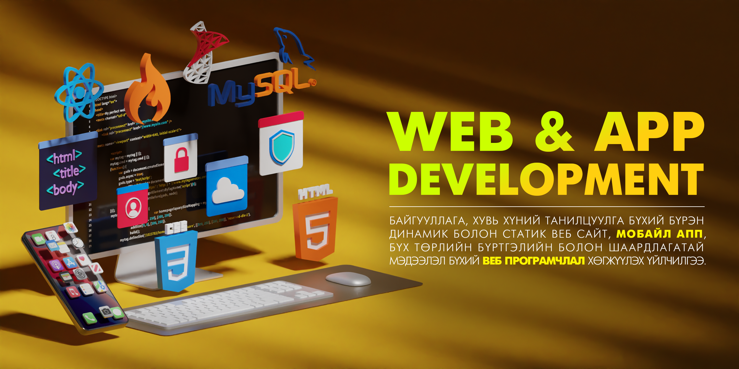 вебсайт болон гар утасны аппликэйшн хөгжүүлэлтийг чанарын өндөр түвшинд хийж гүйцэтгэх үйлчилгээ.